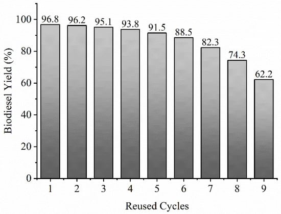 The cost of biodiesel relies on feedstock, energy consumption, labor, catalyst, etc. The results indicated that ~70–80% of the total production cost of biodiesel is accountable to feedstock [87,88,89]. Reusability of solid nanocatalyst could significantly reduce the high cost of MgO nanocatalyst. Experiments are carried out for nine successive cycles at an optimal transesterification condition (M:O: 10.65, MgO CC: 2 wt.%, and RT: 80 °C) determined using GOA. After ensuring a complete cycle of transesterification reaction during biodiesel conversion, the MgO catalyst was recovered or separated from the liquid (biodiesel yield) product subjected to filtration, followed by methanol wash. Later the MgO nanocatalyst was dried in an oven subjected to 100 °C and reused for the next cycle. Figure 7 shows the results of biodiesel yield conversions of nine cycles. The result showed that the conversion rate of biodiesel yield from hybrid (waste coconut and fish oil) oil decreases from 96.81% for the fresh or first used catalyst to 60.43% for the ninth reuse.