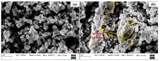 The drop in biodiesel conversion from hybrid oil (waste coconut oil + waste fish oil) is attributed to the following reasons [24,82,90]: (a) partial leaching (i.e., the solubility of Mg in methanol phase) of Mg in reaction mixture over successful cycles; (b) fresh catalyst show crystallinity with definite edges and shapes (refer to Figure 8a), whereas agglomeration of the catalyst after transesterification reaction resulted in deactivation of the catalyst (refer to Figure 8b); (c) block of the catalyst over sites by-products formed (biodiesel yield) during the reaction lead to catalytic poisoning (refer to Figure 8b); and (d) after each cycle, the catalyst recovered loses the crystallinity, which results in loss of catalytic activity.