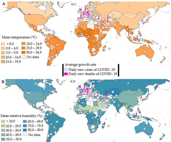 (A) average temperature, and (B) average relative humidity with the average number of new cases and daily deaths of COVID-19. Note: The means were divided daily by the number of the observed days. Reprinted from [25], with permission from Elsevier.