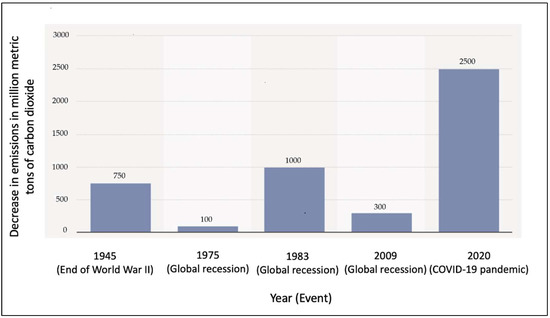 In 2020, Bashir et al. studied the possible relationship between environmental health indicators and the COVID-19 pandemic in California. They reported that pollution levels in metropolitan areas (especially in California, which generally has the worst air quality among American states) decreased during quarantine. This reduction in air pollution was due to the reduction in environmental emissions related to halted (major) economic activities, less road traffic, and home quarantine across the United States [35]. Figure 2 shows the decrease in carbon dioxide emissions worldwide between 1945 and 2020 from major historical events. Data provided by the Guardian (Global Carbon Project) show the decline in emissions in 2020 due to the coronavirus pandemic is the biggest in history. The observed reductions could have signaled a behavioral change in moving away from high emission economies.