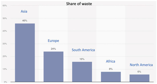 An estimation indicated that a person infected with COVID-19 could generate approximately 3.4 kg of medical waste daily. Among the severe challenges and impacts of the COVID-19 outbreak, there has been an increase of up to 300% in medical waste production, with an increased use of plastics in health facilities and trouble in waste management conventional systems functionality. Medical waste production in China’s Hubei province has increased by 600% (40 to 240 tons), making its management a severe challenge [56]. Nonetheless, an analysis of data from 30 cities showed that solid waste production in major Brazilian cities lowered during the restriction period due to decreased commercial activities [57]. An estimated 8.4 million metric tons of mismanaged plastic waste were generated worldwide during the COVID-19 pandemic, of which 26,000 metric tons were thought to have leaked into the ocean. Asia accounted for almost half of this mismanaged waste, whereas Europe was responsible for a quarter (see Figure 4). The plastic waste mainly originated from sources such as personal protective equipment and COVID-19 test kits.