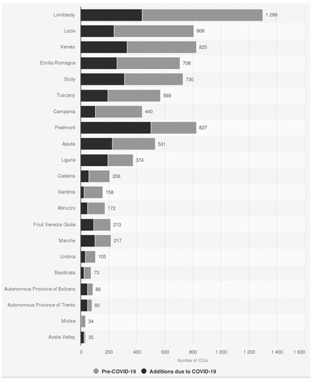 Number of intensive care units (ICU) pre- and post-COVID-19 in Italy in 2020, by region. Source [90].