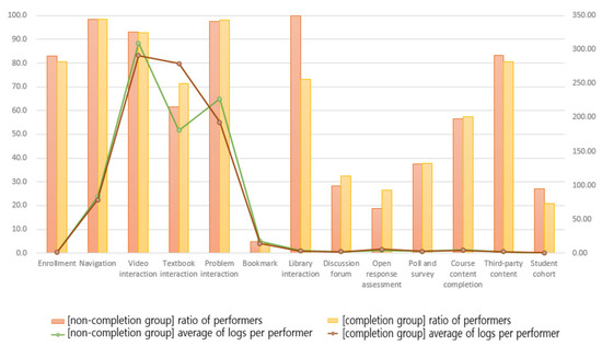In order to check the characteristics and differences of learning activity behaviors by group, the ratio of learners who performed the corresponding event and the number of logs per target learner were checked based on the major and minor event logs. Then, group differences were analyzed using the chi-square test and the independent sample t-test.