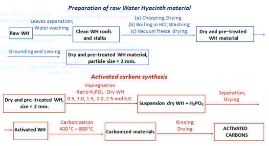 Preparation of the activated carbon from the dry WH was carried out by a chemical activation process with the H3PO4 activating agent. The impregnation ratio was determined as the ratio of the weight of H3PO4 to the weight of the dried WH. The dry and ground WH was impregnated with an H3PO4 solution in 0.5 to 3.0 ratios, with an increment of 0.5. The 20 g of dry WH sample was added to 80 mL of solution, with an appropriate mass of H3PO4, and stirred at 60 °C for 4 h. The solid and liquid phases were separated by filtration through a Buchner funnel and dried at 105 °C for 24 h. The carbonization of activated WH was carried out in an electrical furnace with nitrogen flowing (150 cm3 min−1) and a heating rate of 15 °C min−1. Carbonization for 80 min was conducted at the following temperatures: 400 °C, 500 °C, 600 °C, 700 °C, and 800 °C. The obtained activated carbons were rinsed with hot distilled water until at neutral pH and finally dried at 110 °C for 12 h. The synthesized activated carbons were denoted according to the impregnation ratio and carbonization temperature, e.g., 1.0/600C means that impregnation ratio and carbonization temperature were 1.0 and 600 °C, respectively. A schematic presentation of the raw water hyacinth preparation and activated carbons synthesis is given in Figure 1.