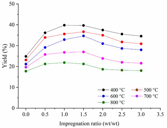 The amount of the activation agent has a similar impact on yields for each carbonization temperature, i.e., activated carbon yields increase as the impregnation ratio rises up to 1.0 or 1.5.