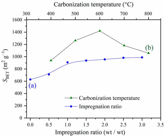 The effects of the impregnation ratio and applied carbonization temperature on the specific surface area (SBET) of activated carbons are shown in Figure 3.