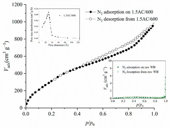 Based on the adsorption–desorption isotherm of raw WH (embedded in Figure 4) and the results from Table 1, it can be noticed that the amount of adsorbed nitrogen and the SBET and Vtot values are quite low. The raw WH has characteristics of a macroporous material, and the Vmic, Vmeso, and Dp cannot be measured. The obtained results are expected for raw lignocellulose material. On the other hand, the impregnation process followed by carbonization under optimal conditions dramatically increased the textural properties of the treated sample. The prepared activated carbon show both micro- and mesoporosity. The sample 1.5/600C has a micropore volume of 0.294 cm3 g−1 and a significantly higher mesopore volume, of 0.446 cm3 g−1. The percentage of mesoporosity obtained, for the ratio of Vmeso to Vtot, is equal to 60.2%. Based on these values, the sample can be described as a dominantly mesopores material, which is a crucial characteristic for the access of the adsorbate molecules to the interior of the adsorbent particles. Several researchers also found that activated carbons derived from different lignocellulose precursors showed micro-and mesoporosity after treatment with phosphoric acid [15,16].