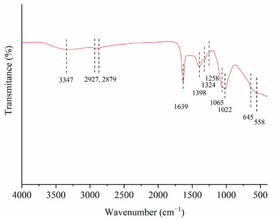 The assignations of the IR bands from Figure 5 were based on the literature data on infrared spectroscopy absorption [30]. The band at 3347 cm−1 is assigned to the O–H stretching vibration of the hydroxyl groups. The two bands at 2927 cm−1 and at 2879 cm−1 are related to the C–H stretching vibrations of the –CH2– and –CH3 groups, respectively. A sharp and intensive band 1639 cm−1 is attributed to both the aromatic C=C bond and/or to the carbonyl group (C=O). The bands at 1398 cm−1 and at 1324 cm−1 are ascribed to the O-H bending vibration of the carboxylic group and phenol structure, respectively. A weak band at 1258 cm−1 can be attributed to the P=O symmetric vibration, while the small shoulder around 1065 cm−1 could be connected with the P–O vibration in the acid phosphates and to the symmetrical vibration in the C–O–P chain [31]. The broad band at 1022 cm−1 originated from the C–O stretching vibrations, while the two weaker bands between 645 and 558 cm−1 were ascribed to the aromatic structures [31,32].