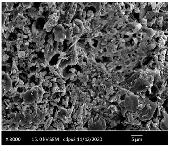 The SEM image of the raw WH has been previously published [18]. In the raw WH morphology, some parts of the smooth area and the moderately developed surface can be observed, which have the characteristics of non-treated lignocellulose materials. After the process of chemical activation (by H3PO4) and carbonization (at 600 °C), the morphology of the sample starts to be more developed, with open canals and cracks. Furthermore, the presence of different sizes and shapes of macrostructure pores can be noticed.
