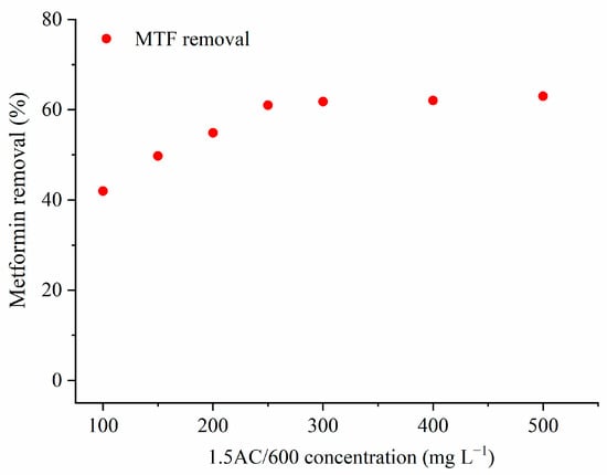 The results show that the percentage of MTF removal increased from 41.9% to 61.0%, with an increase in AC concentration from 100 mg L−1 to 250 mg L−1. The AC concentrations higher than 250 mg L−1 did not significantly affect the removal of MTF. Therefore, a concentration of adsorbent of 250 mg L−1 was chosen for further adsorption experiments. The higher concentrations of adsorbent can lead to the aggregation of the adsorbent particles, decreasing the available surface area and, consequently, decreasing the removal of the adsorbate [33].