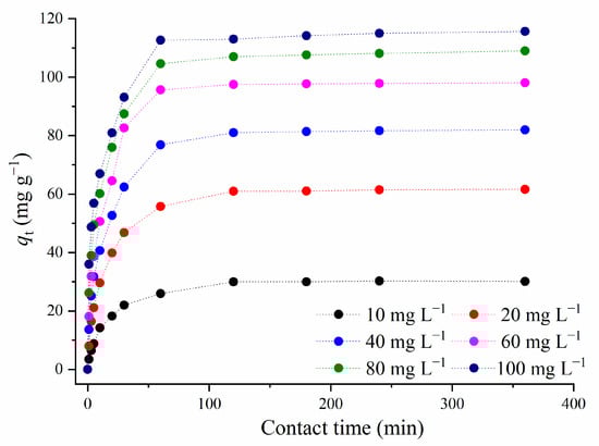 The influence of the initial adsorbate concentration on the amount of the adsorbed MTF for different contact times is presented in Figure 8.