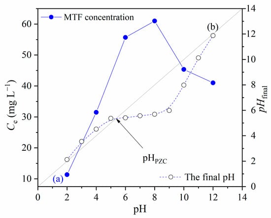 (a) The effect of the pH of MTF solution on adsorption; (b) the point of zero charge for 1.5/AC600; (CMTF = 20 mg L−1; C1.5AC/600 = 250 mg L−1; T = 25 °C; t = 120 min).