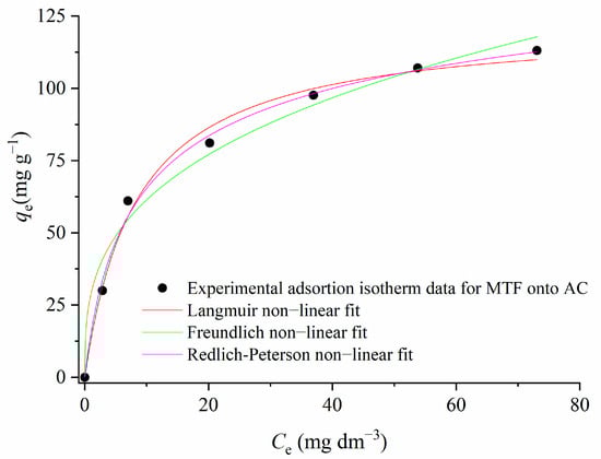 Three different adsorption isotherm models, Langmuir, Freundlich, and Redlich–Peterson, are applied to the experimental data for MTF adsorption at 1.5AC/600 and 25 °C, which are presented in Figure 10, while the calculated isotherms parameters are given in Table 2.