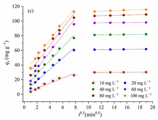 Figure 8 shows that the MTF adsorption approached a plateau after 120 min, for all investigated initial concentrations of the adsorbate. Due to this result, 120 min was taken as the equilibrium adsorption time. For the initial concentrations of MTF higher than 40 mg L−1, more than 50% of MTF was adsorbed within the first 15 min, while for the lower concentrations of adsorbate (10 mg L−1 and 20 mg L−1), half of the totally adsorbed metformin was removed in 20 min. The drastic increase in adsorption for such short times may be due to the availability of vacant adsorption sites on the adsorbate surface. With increasing contact time, adsorption sites become occupied, and adsorption equilibrium is reached. After an equilibrium time of 120 min, there is no significant increase in the amount of adsorbed MTF.