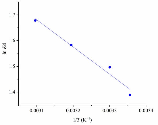 Based on the values of the slope and intercept, the values of ΔH and ΔS were calculated, with values of 8.77 kJ mol−1 and 41.14 J·K−1·mol−1, respectively. The standard Gibbs free energy change (ΔG°) was found to be −3.44 kJ mol−1 at 298 K, confirming the feasibility and spontaneity of the adsorption process.