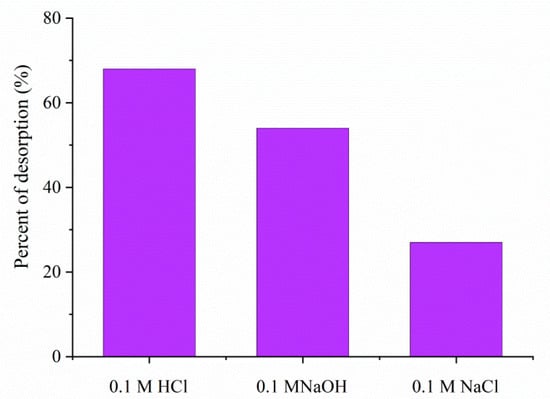 The reusability of 1.5AC/600 can be one of the most significant criteria for its practical application in real systems. Hence, finding the appropriate and most effective desorption agent was one of the most important tasks of this study. The desorption was primarily performed from 0.1 M solutions of NaOH, HCl, and NaCl (Figure 13).