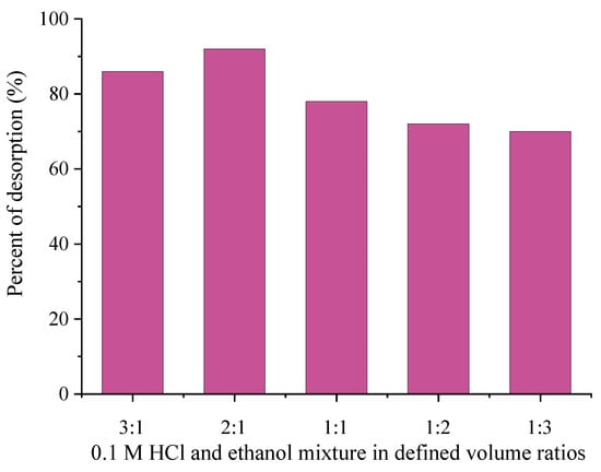 Based on the literature survey, it was found that the desorption process for some adsorption systems is efficient in the presence of an acid–ethanol mixture [57,58]. In order to achieve a higher amount of the desorbed MTF than that obtained in the presence of 0.1 M HCl, mixtures of 0.1 HCl and 96% ethanol in different volume ratios (3:1, 2:1, 1:1, 1:2, 1:3) were tested and are shown in Figure 14.
