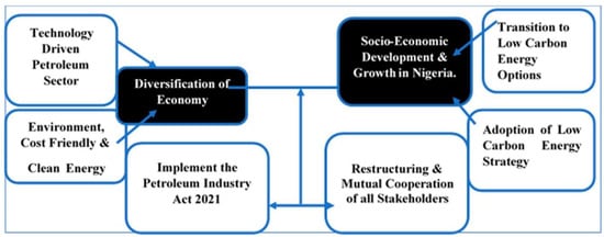 The concept of preparing the hybrid model designed by the authors is to combat the impacts of crude oil price shock on Nigeria’s economy, to promote economic diversification and to focus less on the petroleum sector [40]. To promote energy diversification by integrating renewable energy and other low carbon energy sources into the national energy mix to promote technology development and to encourage active engagement of the citizens (especially youth) in the development of low carbon energy technologies. Review of the current legal frameworks on energy security, contracts and regulatory institutions in the oil and gas sector to ensure that they are compliant with the global low carbon energy transition objectives.