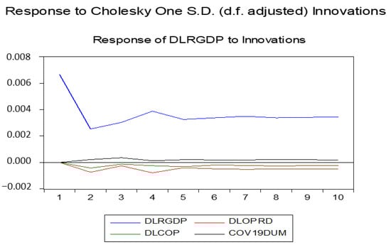 The response of real economic growth to its own one standard innovation and one standard innovation from crude oil production, crude oil price and COVID-19 pandemic is presented in Table 6. It is shown that oil production and price exhibit a negative shock on real economic growth throughout the horizon while real GPD own one standard innovation and COVID-19 pandemic portray a positive shock effect. The real GDP own standard innovation maintained a positive shock but fluctuated between 0.002532 in the second horizon to 0.006651 at the first horizon. Crude oil production shows a one standard negative shock between −0.000254 in the third horizon to −0.000785 in the fourth horizon. Consequently, crude oil price exerts one standard innovation with the lowest negative shock (−0.000130) seen in the third horizon and −0.000419 in the second horizon. COVID-19 pandemic shows a positive shock impact in the short-run from0.000359 in third horizon to 0.000198 in the 7th horizon. Hence, it is evident from this study that while oil production and pricing were characterized with a negative shock on real GDP while COVID-19 exerts a positive shock impact. Notably the shocks were characterized by fluctuating structure.