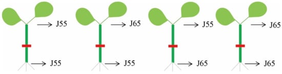 The experimental design of graft eggplant combination, four grafted combinations were designed, including rootstock (J55)-scion (J55), rootstock (J55)-scion (J65), rootstock (J65)-scion (J55) and rootstock (J65)-scion (J65).