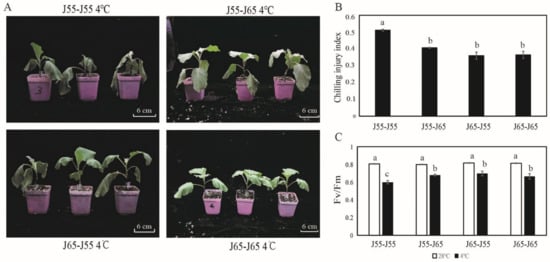 Phenotype of four combinations of grafted eggplant after cold stress: (A) phenotype of plant after 4 °C treatment 12 h, the wilting degree from J55-J55 is more seriously; (B) the chilling injury index of four grafted combinations; (C) the value of Fv/Fm from the four grafted combinations under 28 °C and 4 °C, the white bars represent the value of Fv/Fm under 28 °C and the black bars represent the value of Fv/Fm under 4 °C, a and b represent the significance.