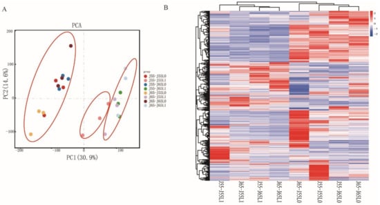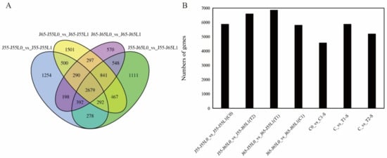 Twenty-four libraries were constructed, and samples were collected from four grafted eggplant J65-J65, J65-J55, J55-J65, and J55-J55 leaves at 28 °C and 4 °C for 12 h treatment and designed as J65-J65L0, J65-J55L0, J55-J65L0, J55-J55L0, J65-J65L1, J65-J55L1, J55-J65L1, and J55-J55L1. A total of 167.16 Gb data were obtained, the clean data produced from each sample was no more than 5.84 Gb, with Q30 > 92%, and GC content > 42% (Supplementary Table S2). Reference sequences mapped to the annotated genome of S. melongena L. from/ftp/genomes/Solanum melongena_V4.1/ (https://solgenomics.net/ftp/genomes/Solanum_melongena_V4.1/ (accessed on 2 January 2022)). The dimensionality reduction analysis using PCA found that there exists a large difference before and after low-temperature treatment. After low-temperature treatment, the difference between the J65-J65, J55-J65 and J65-J55 grafted combinations was not obvious, but it was significantly different from that of J55-J55, which was different from the no obvious difference between the materials before treatment (Figure 3A) and many different expression genes were obtained (Figure 3B).