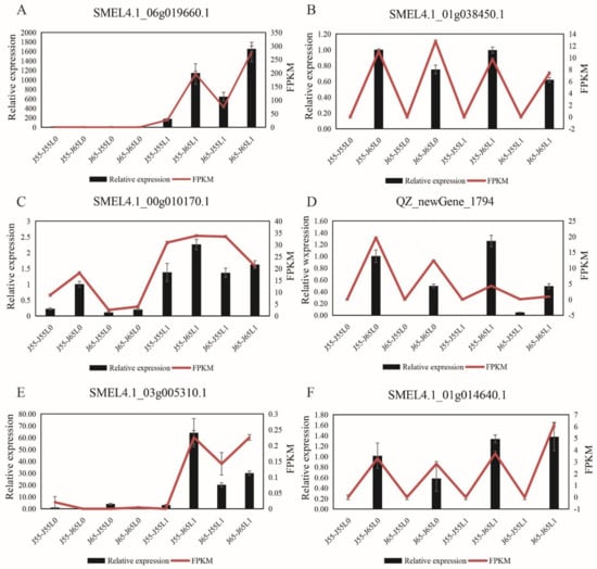 Validation of transcriptome data by qRTPCR analysis. A total of six genes were validated including SMEL4.1_06g019660.1 (A); SMEL4.1_01g038450.1 (B); SMEL4.1_00g010170.1 (C); QZ_newGene_1794 (D); SMEL4.1_03g005310.1 (E); and SMEL4.1_01g014640.1 (F). The black bars represent the relative expression of genes in four grafted eggplant leaves before and after cold stress by qRT-PCR analysis, and the red line represents the value of FPKM from RNA−Seq.