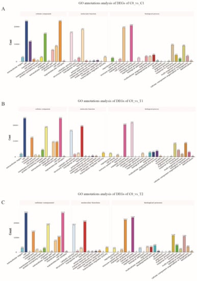 Gene ontology (GO) statistics and enrichment analysis of identified specifical differentially expressed genes (DEGs) of self-grafted cold sensitive and cold tolerance eggplant induced by cold stress, C0_vs_C1 (A); self-grafted and heterografted eggplant induced by cold stress with different rootstock, C0_vs_T1 (B); and with different scions, C0_vs_T2 (C). Different colors represent different GO terms. The numbers on the bar graph indicate the number of differential genes.