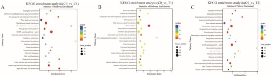 The KEGG enrichment analysis of DEGs. Top 20 enriched KEGG pathways of identified specifical DEGs of C0 _vs_C1 (A), C0_vs_T1 (B), and C0_vs_T2 (C). The size of the circle indicates the quantity of genes, and the different colors mean the difference in q value. The redder the circle, the smaller the q value. The Y-axis represents the terms of KEGG pathway cluster, and the X-axis represents the enrichment factor.