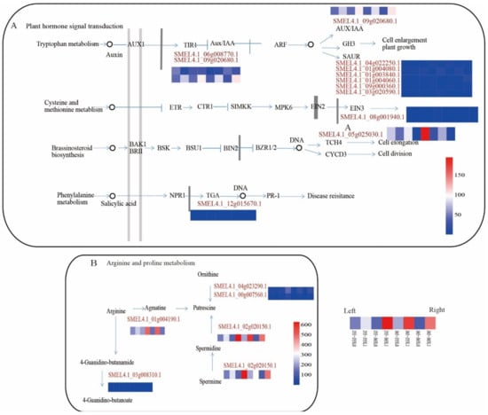By analyzing the DEGs using the KEGG pathway, we predicted that the plant hormone signal transduction pathway is a vital method of regulating cold tolerance in eggplant. With cold tolerance material as rootstock, this pathway can be promoted to improve the cold tolerance of grafted eggplant. Meanwhile, arginine and proline metabolism can be activated to improve the cold tolerance in grafted eggplant. Therefore, these two pathways were chosen for further analysis.