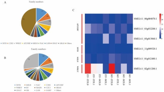 As important regulatory genes, transcription factors are particularly important for plants. They participate in the transcription of a range of cold-responsive genes to regulate the cold tolerance of crops. A large number of reports have shown that MYB, AP2/ERF, WRKY, bHLH, bZIP, NAC, and C2H2 family all are involved in the regulation of cold stress tolerance [,,,,]. We analyzed the transcription factors expression level between cold sensitive and cold tolerant grafted eggplant combination after cold stress induced by material, and the different transcription factors mainly focused on MYB, AP2/ERF, bHLH and WRKY family. Predicted that the cold-tolerant eggplant can increase the expression of transcription factor families including MYB, AP2/ERF, bHLH and WRKY to be included in the cold tolerance of grafted eggplant combination.