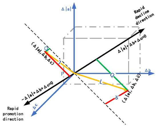 Let Q be the point (Δ|𝑎|, Δ𝑏, Δ𝑐) and the straight lineΔ|𝑎| + Δ𝑏 + Δ𝑐 = 0 the perpendicular distance; P is the perpendicular distance from the point to the line −Δ|𝑎| + Δ𝑏 + Δ𝑐 = 0 the perpendicular distance; L is the distance from the point to the origin of the coordinates, and the more significant L indicates the more significant change in network toughness. The larger , the higher the development quality of network toughness is represented, and R is used to represent the network toughness, then where the positive and negative signs represent whether the network toughness is improved or reduced.