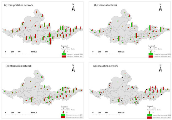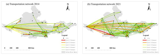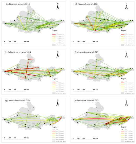 First, the transportation network, financial linkage network, information exchange network, and innovation cooperation network obtained in the previous section are binarized using the maximum inter-class difference method to select the optimal threshold for the eight networks between the years 2014 and 2021; then, the multiple urban networks are graded using the natural breakpoint method using ArcGIS10.7 to express the visualization of the spatial network structure of the urban agglomeration in the Yellow River basin. as shown in Figure 3.
