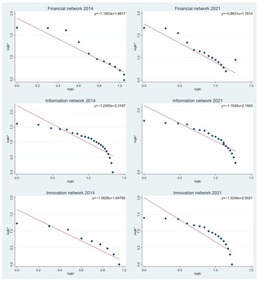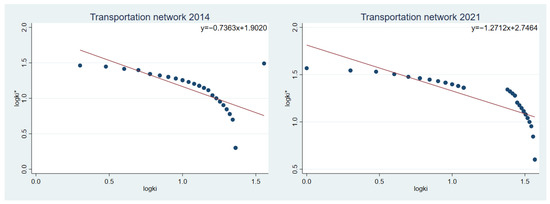 where 𝐶 is a constant and 𝑘∗ is the node 𝑖, the ranking of the nodes, and 𝑎 is the slope of the curve and is a negative number. Taking logarithms of both sides of Equation (2) simultaneously yields Equation (3), which means that the logarithm of the network node degree is linearly correlated with the logarithm of the city order.
