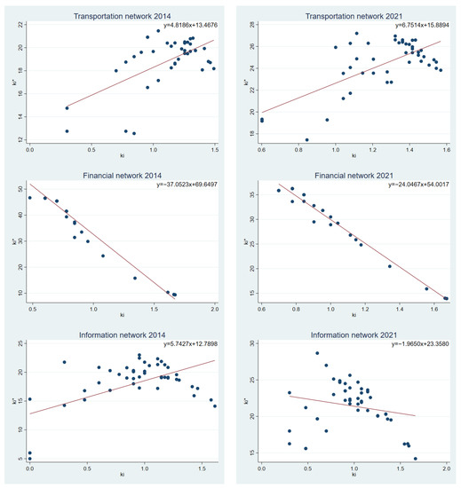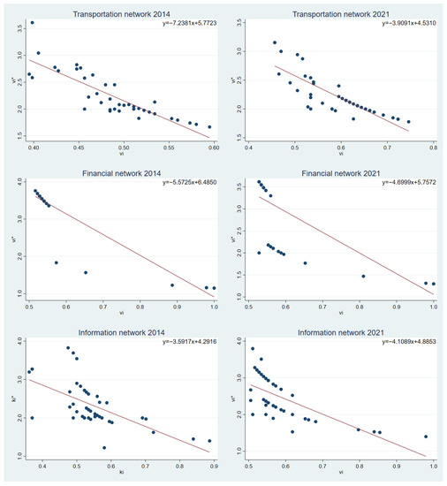 The absolute value of the slope of the transportation network changes more from 0.7363 in 2014 to 1.2712 in 2021, which indicates that the core city’s position in the transportation network is strengthened; the hierarchical nature of both the information exchange network and the financial linkage network decreases by one place in 2021, and the absolute value of the slope of the financial linkage network decreases from 1.1853 in 2014 to 0.8631 in 2021.