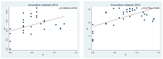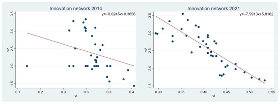 The degree correlation coefficients of the multi-city network are calculated according to Equations (4) and (5), as shown in Figure 6. The characteristics of homogeneity and heterogeneity of the network structure vary with time and network type. The characteristics of homogeneity show information > transportation > innovation in 2014, while it shows transportation > innovation in 2021, and heterogeneity shows finance > information in 2021.