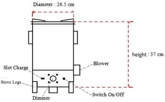On the upper skeletal side, there is a handle. Biomass stoves are equipped with handles so that users can move furnaces quickly and safely [23]. The bottom of the stove has a buffer leg due to the circular dimensions of the stove. If the place of the stove mat is not there, we can use three supporting legs with a height of 12 cm.