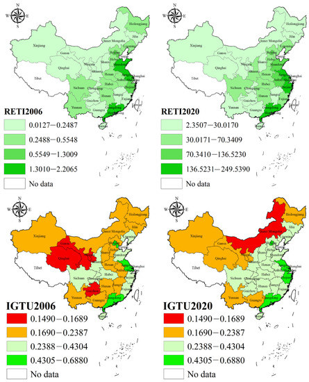 Temporal and spatial evolution of RETI and IGTU in China from 2006 to 2020.