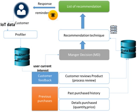 The proposed system is made up of four major parts, as indicated in Figure 5. The amount and price of previous purchases are identified via the previous purchase’s module. The customer feedback module extracts the target consumer information. The MD (manager decision) decision module examines the present context’s impact and makes a final suggestion to the customers. The recommendation approach module checks customers’ reminders.