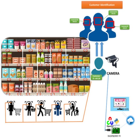 The Figure 6 below shows the step-by-step process related to the purchasing activity performed in the store by the customer starting from entering the store, to the detection through cameras sensors until buying something or not. Each time a customer enters the store, a camera identifies him or her. If the customer already has a profile, i.e., he or she is not a new customer then the application searches his or her profile to find his or her favorite products and preferences from the store’s database. The customer is then informed about the availability of his or her preferred products. If the customer is new, then the application creates a new profile (Profile 0), including his or her photo and the list of products that may interest him or her. Then, the application displays the products accordingly.