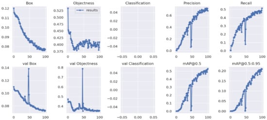 The graphs of the metrics curves as training advances are shown in Figure 15. After validation for the YOLOv5 model were obtained, a recall score of 0.95, and mAP values of 0.95 and 0.5.