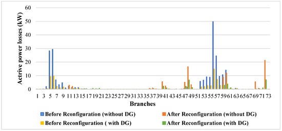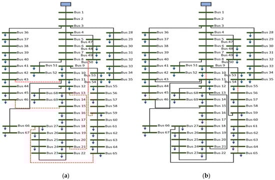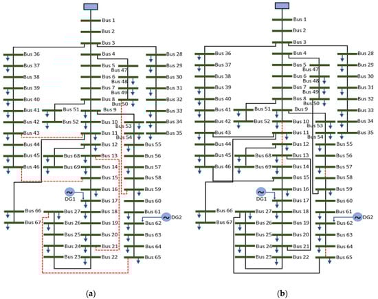 The distribution network (DN) is one of the main components of the electric power delivery chain. The main role of a DN is to distribute electrical energy from high voltage substations to the end customers by adjusting the voltage level if it is necessary []. Due to the customers’ requirements, distribution system operators have faced various technical challenges. In fact, to meet power users’ demands, power quality, system stability, reliability level, load balance, and radial DN structure must be guaranteed []. Add to that, DNs are usually operated radially to reduce operation costs and facilitate the coordination of protections in a unidirectional power flow (PF) [,]. However, most of the real power losses in power networks are caused by current flow in radial DNs []. Technically, real power losses could lead to the deterioration of the voltage profile in power networks.