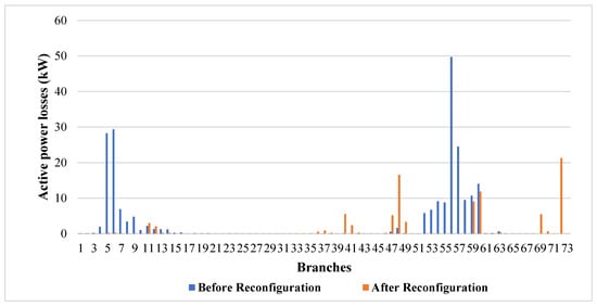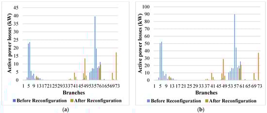 A moth–flame optimization methodology was mentioned in [] to solve the ORRDN problem considering power losses and network reliability. With the same aim of reducing power losses, improved selective BPSO and GA-based methods have been proposed, respectively, in [,], to overcome the reconfiguration problem of the balanced network.