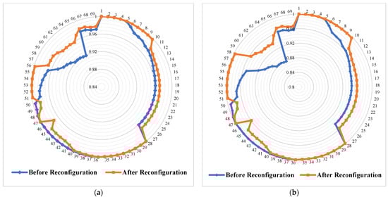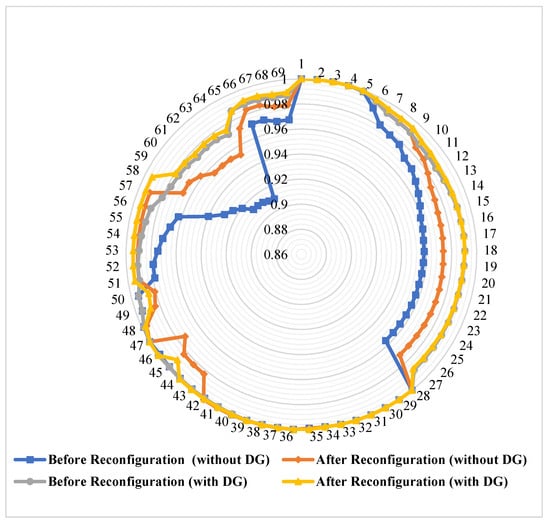 The ORRDN can be obtained through the minimization of TAPL and the improvement of VP. In this study, the objective function (OF) used for the optimal reconfiguration problem is expressed by Equation (1) [].