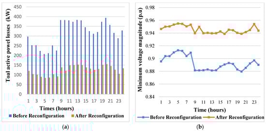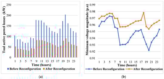 Overall, among all the resulting configurations, the optimal configuration which will be maintained throughout the day is X = [69, 13, 12, 55, 62] obtained at 10 h. The adopted configuration ensures a TAPL reduction equal to 68.19% and an increase in the MVV varying from 0.8813 pu to 0.9497 pu as shown in Figure 14a and Figure 14b, respectively.