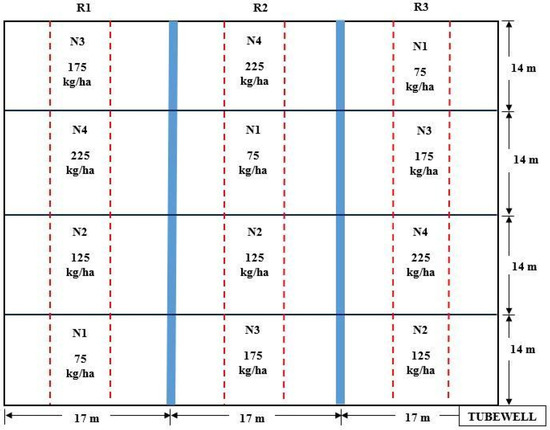| N Levels (kg ha−1) | Basal Dose | First Dose (10 DAT) | Second Dose (40 DAT) | Third Dose (60 DAT) | Fourth Dose (80 DAT) | Total |