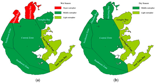 Trophic levels of different lake areas in Taihu in wet (a) and dry (b) seasons.
