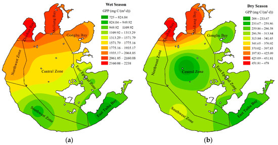 - The primary productivity in the wet season is about five times larger than that in the dry season. Zhushan Bay and Meiliang Bay have the largest PPeu values, which are significantly higher than those of other lake areas regardless of the season, while East Epigeal Zone and East Taihu Bay always have the lowest PPeu values. The spatial distribution of primary productivity is obviously inhomogeneous in the wet season, while the distribution of PPeu in the dry season is uniform in different lake areas and does not show significant differences.