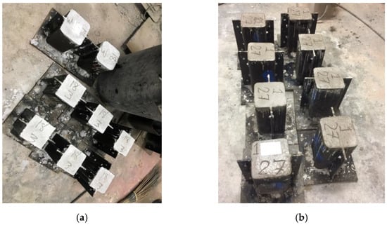 Each specimen measured in cross-section and 300 mm in height to achieve the height-to-width ratio of 2.0. All of the specimens were cast in steel molds of the same dimensions. However, the steel molds were round to a corner radius of 26 mm for the Group 2 specimens, as shown in Figure 2a, whereas the rectilinear-shaped molds were used for the Group 1 specimens. The concrete was poured in three equal layers in each mold, whereas proper compaction (using vibrating poker) was applied to each layer. The specimens were taken out of the molds after one day of casting and cured for 28 days in laboratory environments (i.e., temperature was approximately 30–33 degree centigrade and humidity was 65–75%). The strengthening of specimens was performed after their curing by using a hand layout.