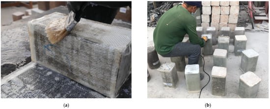 The surface of each specimen was properly cleaned and smoothed before applying GFRP. Epoxy resin was applied to the concrete surface by using a hand brush to impregnate the surface. This was followed by wrapping GFRP around the specimens. The first layer of GFRP was epoxy impregnated using a brush (see Figure 3a), before the application of the second layer. This process was repeated for the subsequent GFRP layers. Finally, the extended GFRP sheets above and below the top and bottom surfaces were ground, as shown in Figure 3b.